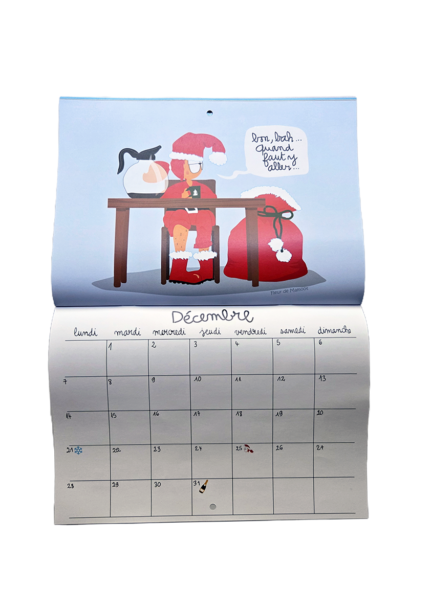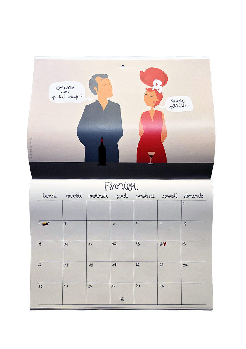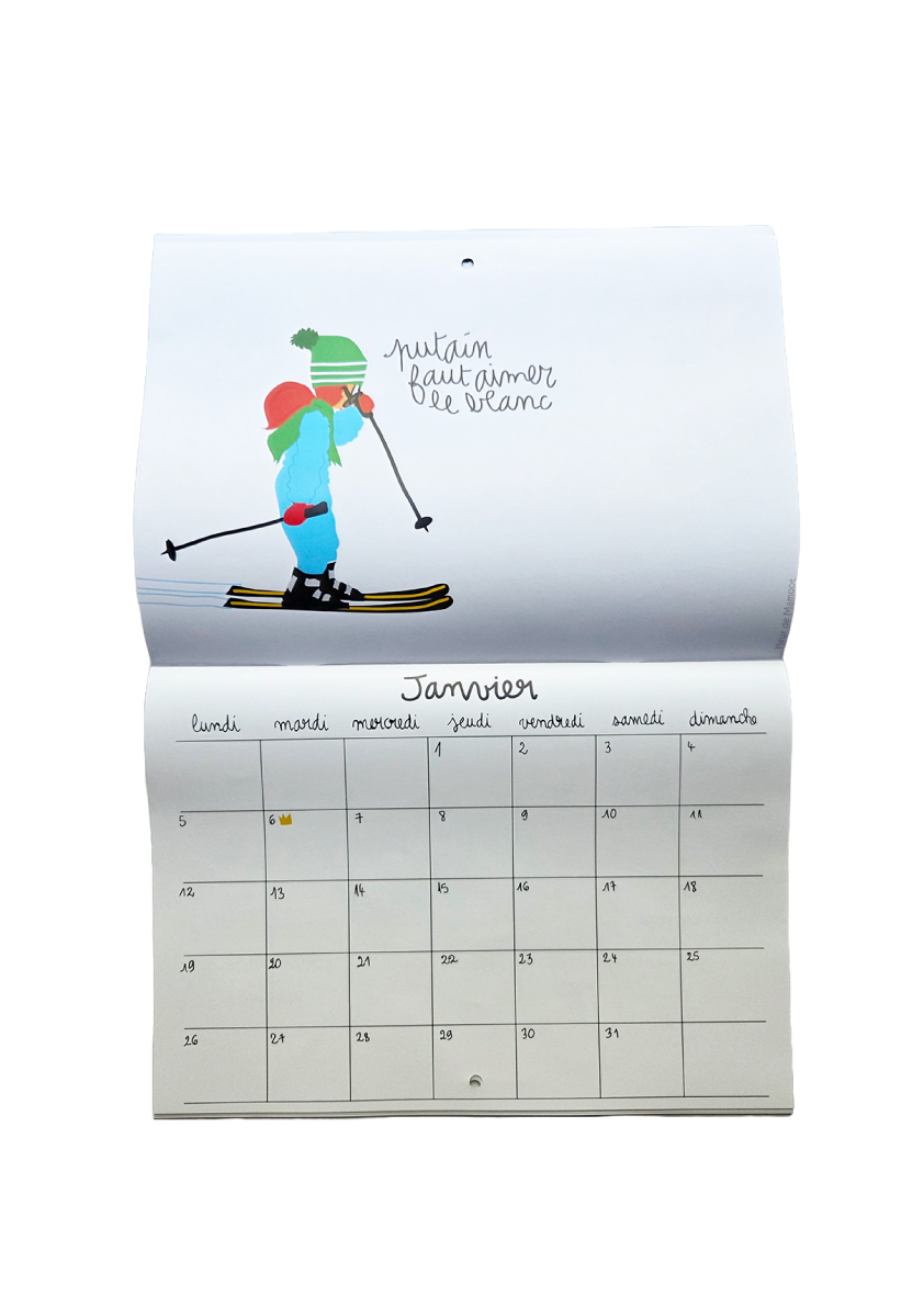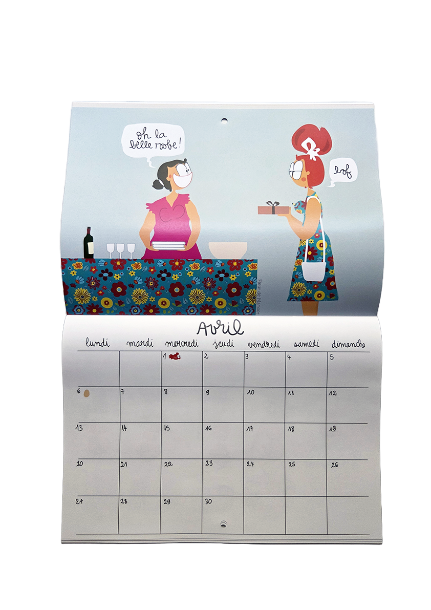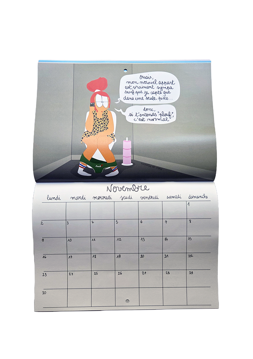 Calendrier mural avec 12 dessins humoristiques et 12 grilles calendaires. Equipé d’un trou au centre pour être accroché où il se doit.