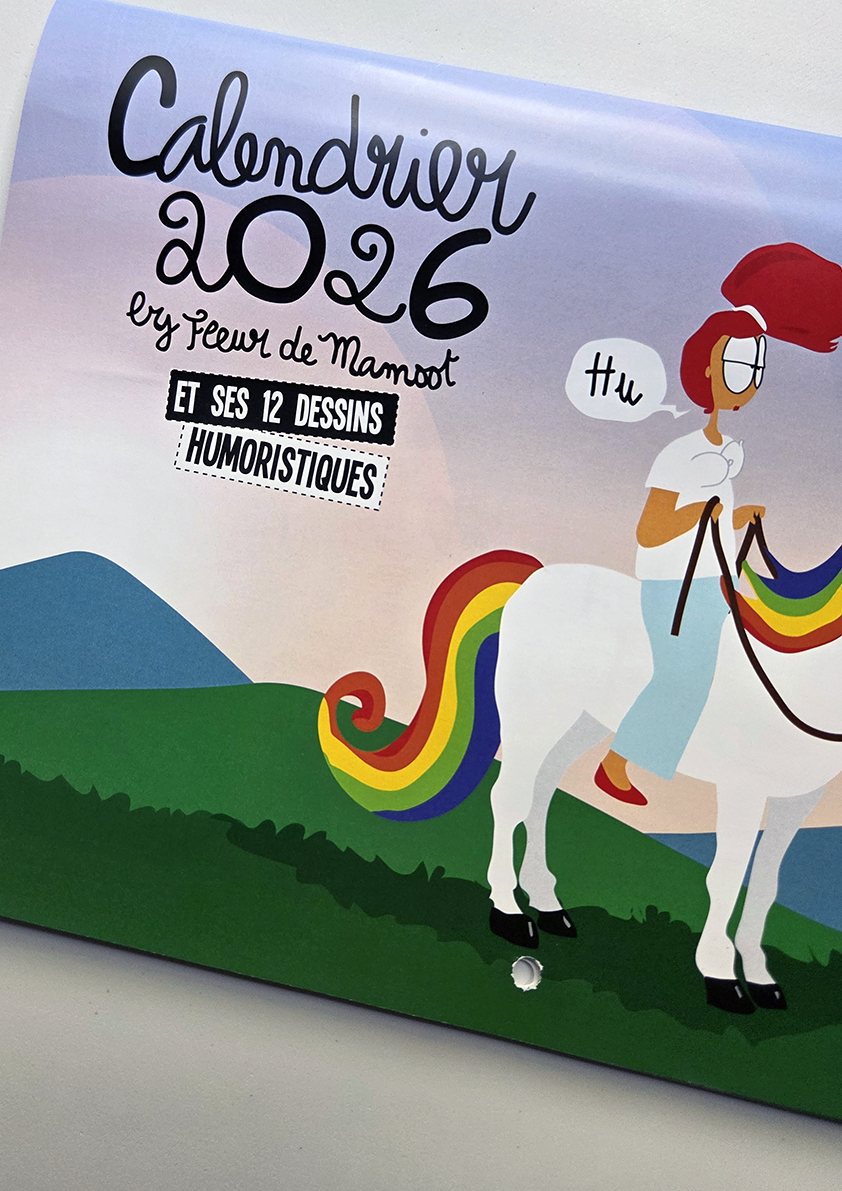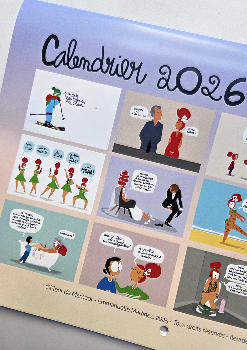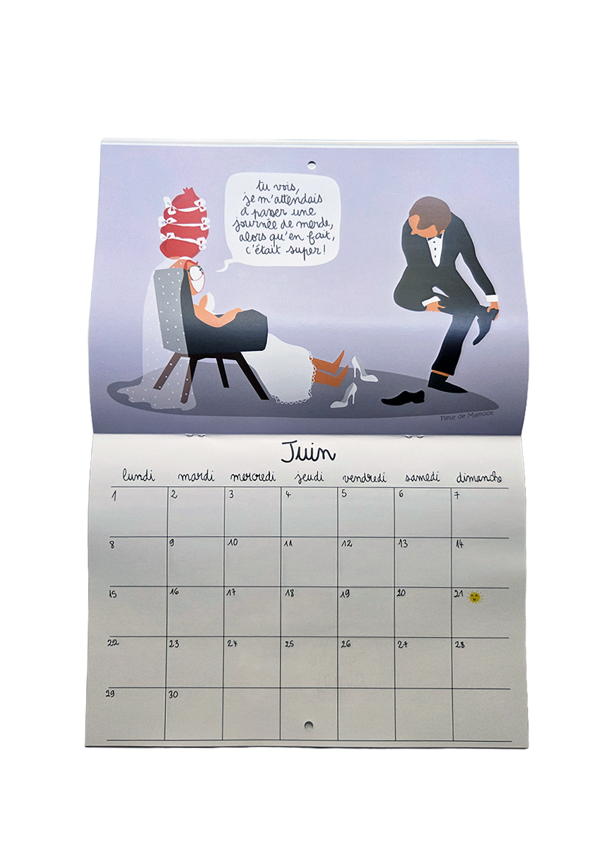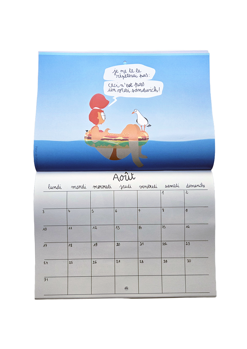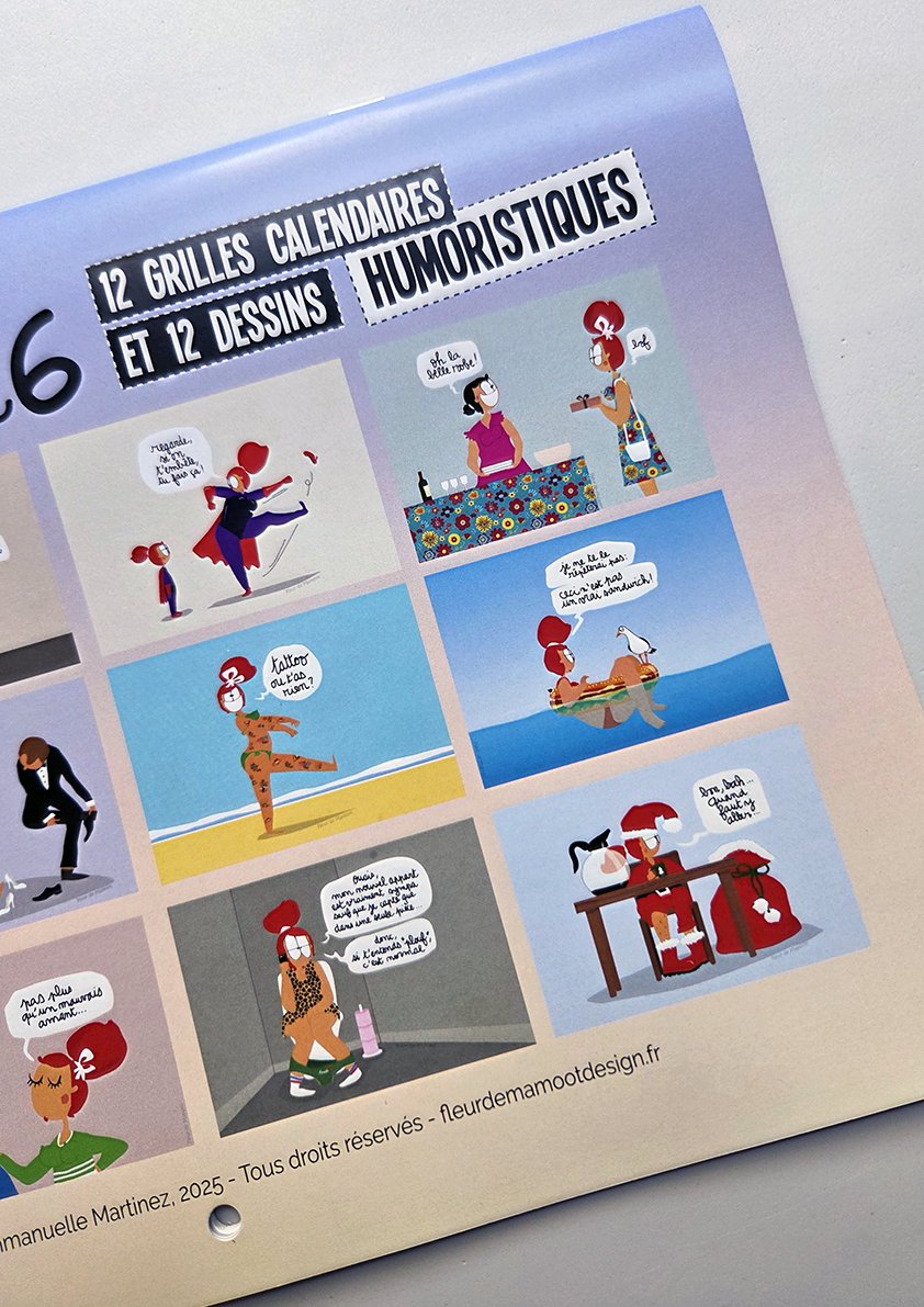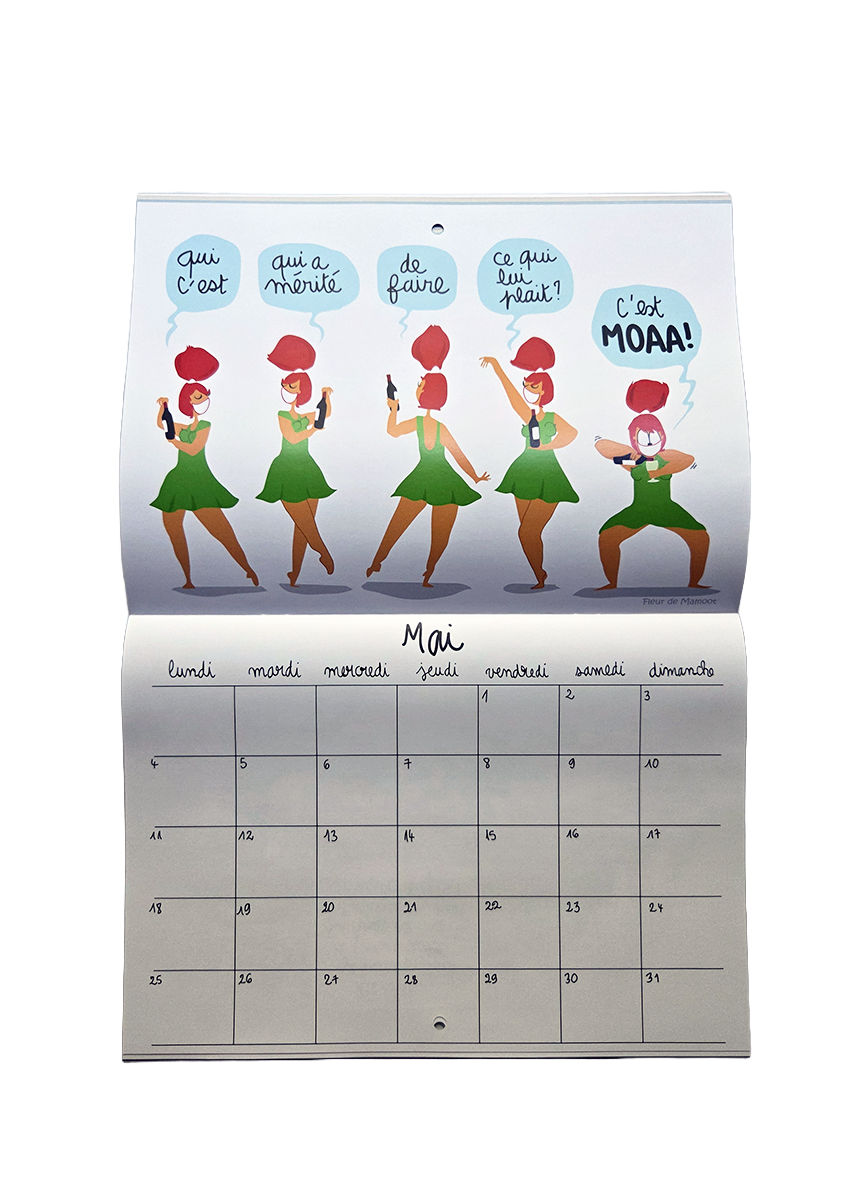 Calendrier mural avec 12 dessins humoristiques et 12 grilles calendaires. Equipé d’un trou au centre pour être accroché où il se doit.