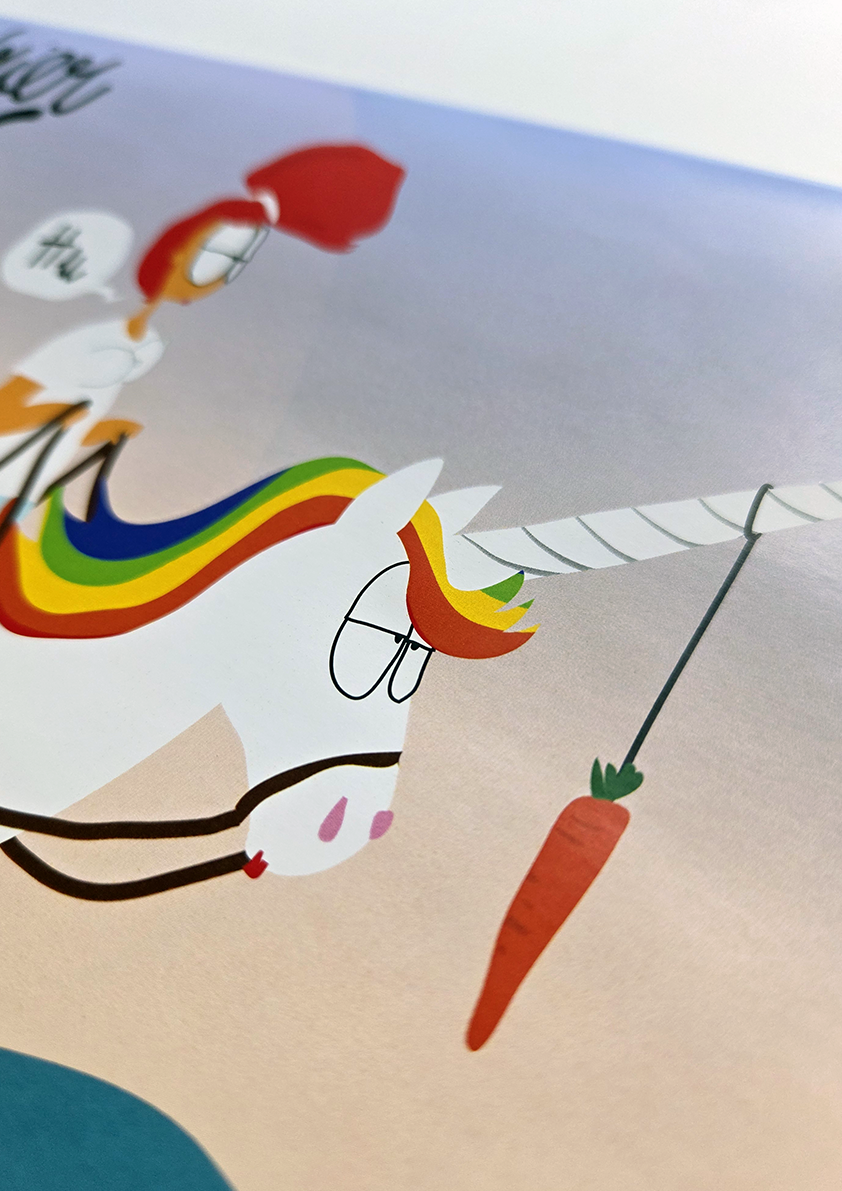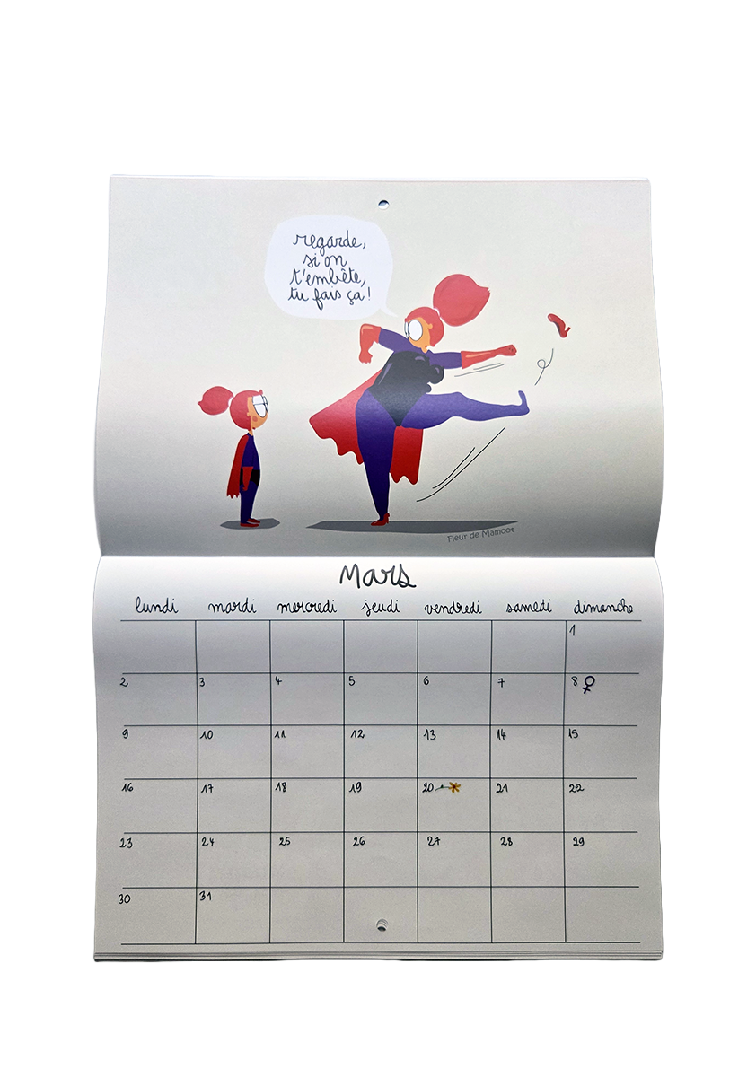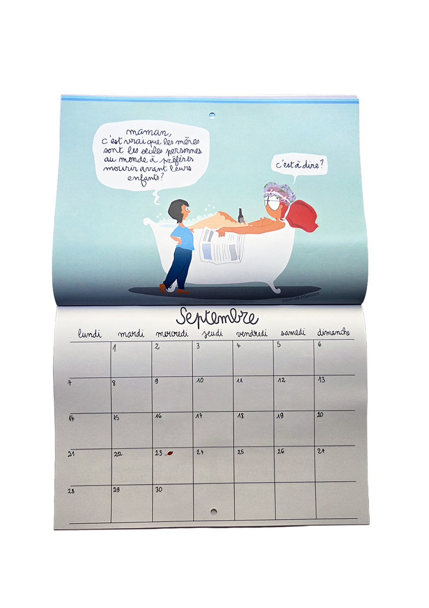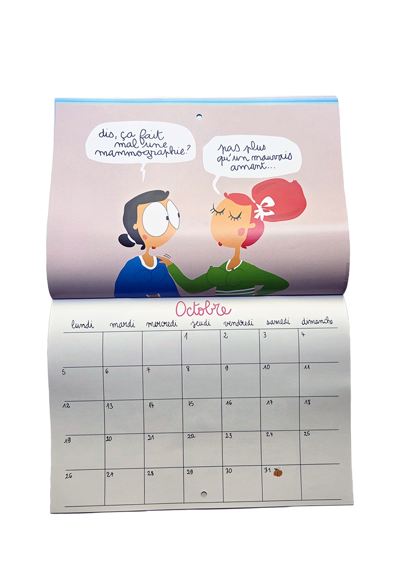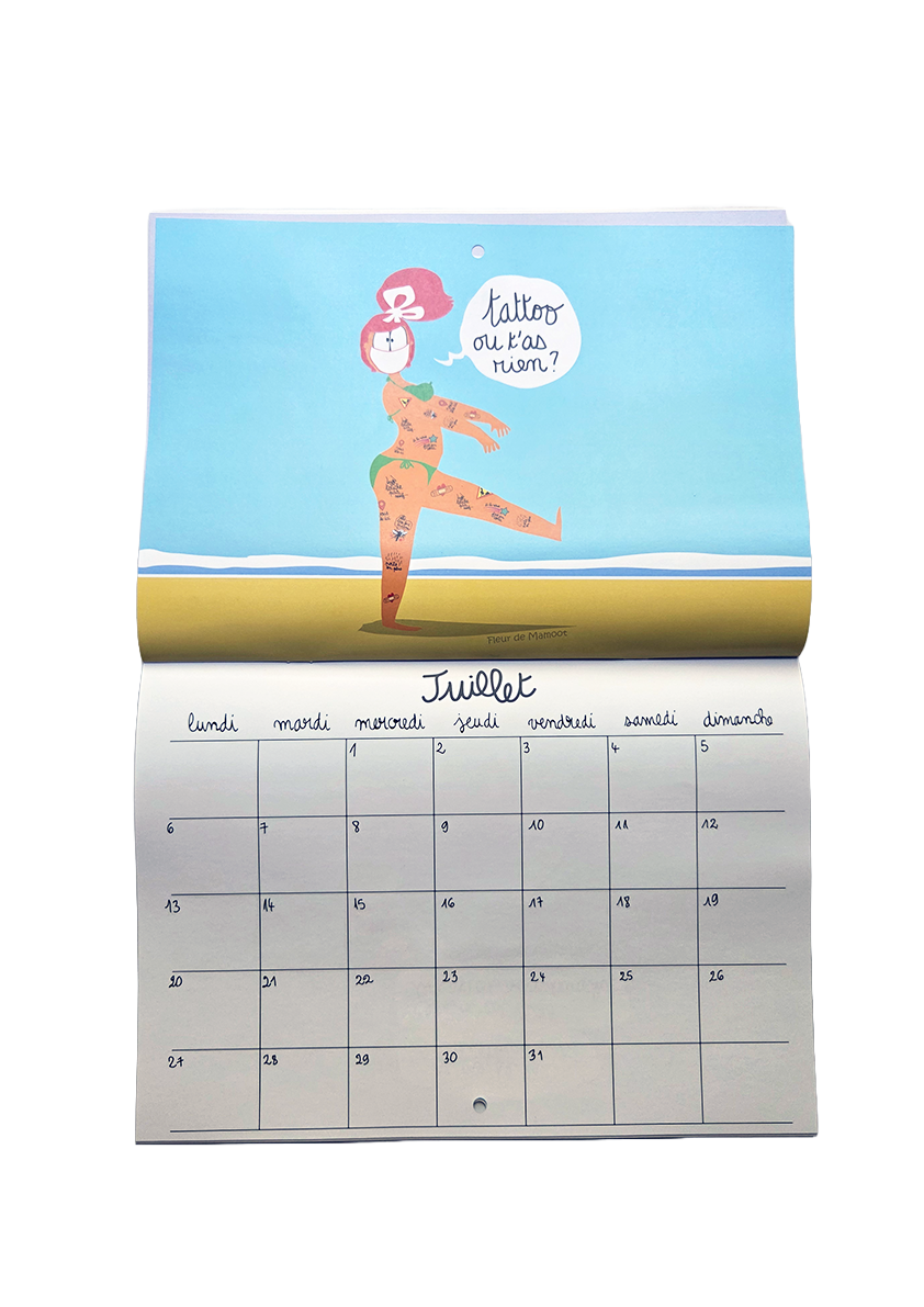 Calendrier mural avec 12 dessins humoristiques et 12 grilles calendaires. Equipé d’un trou au centre pour être accroché où il se doit.